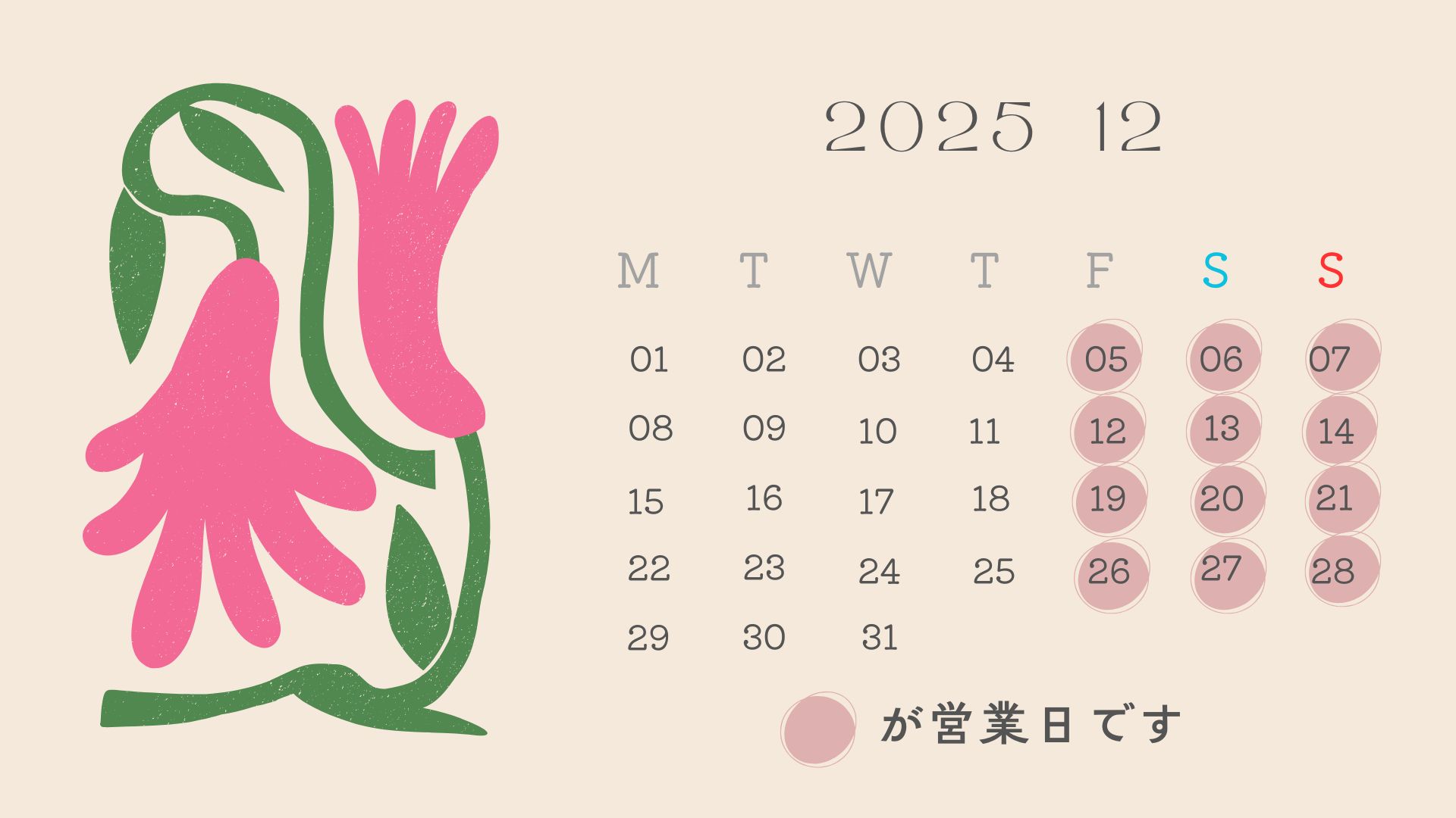 12月の営業日は通常通り金・土・日曜日です。
