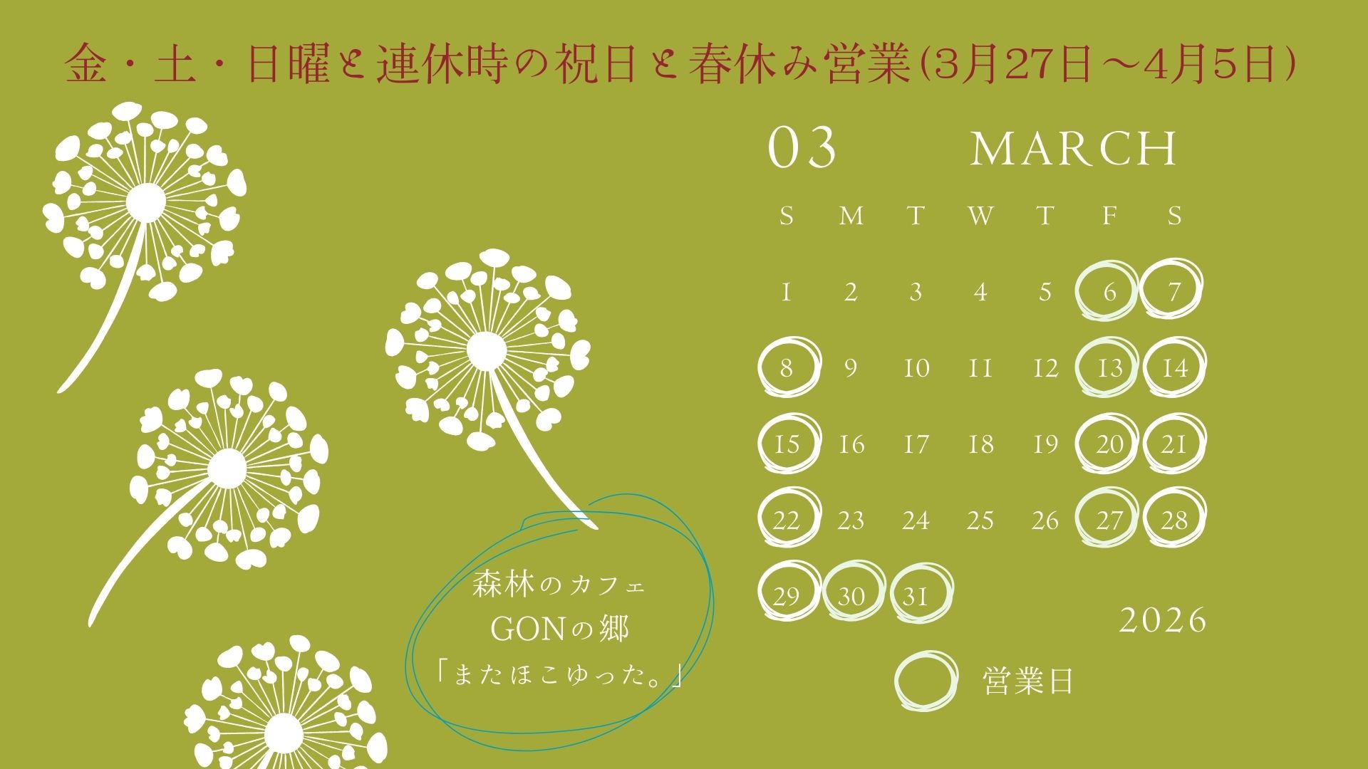 森林のカフェGONの郷「またほこゆった。」3月営業日