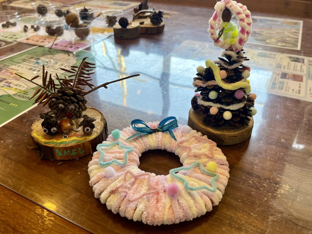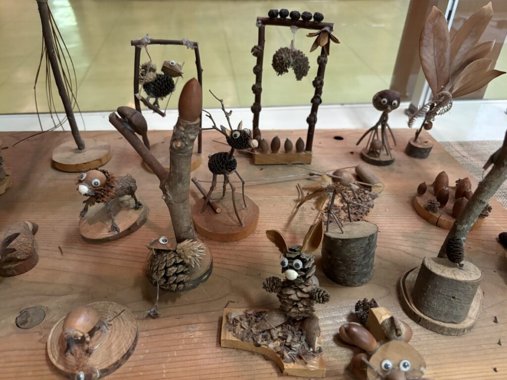 ふるさと館内では、土・日・祝限定でセルフクラフトを行っています。体験料500円で公園内の木の実や植物を使用したオリジナルの作品を作ることができます。体験される場合は館内受付までお声がけください。