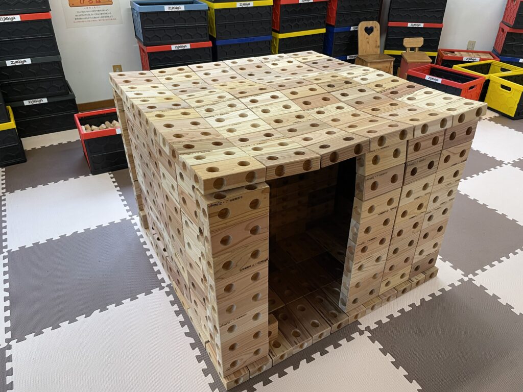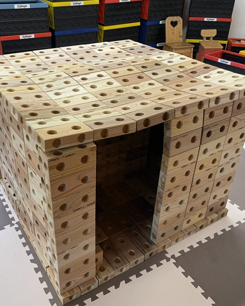 木製玩具「ズレンガ」で木のおうちが作れます。