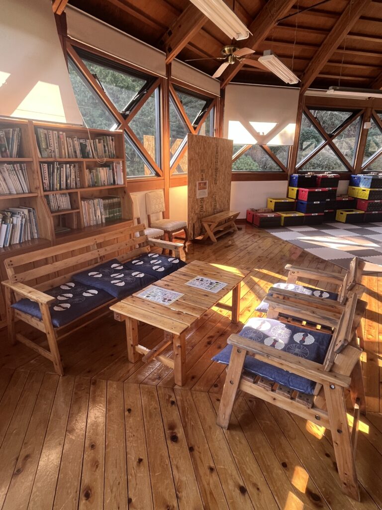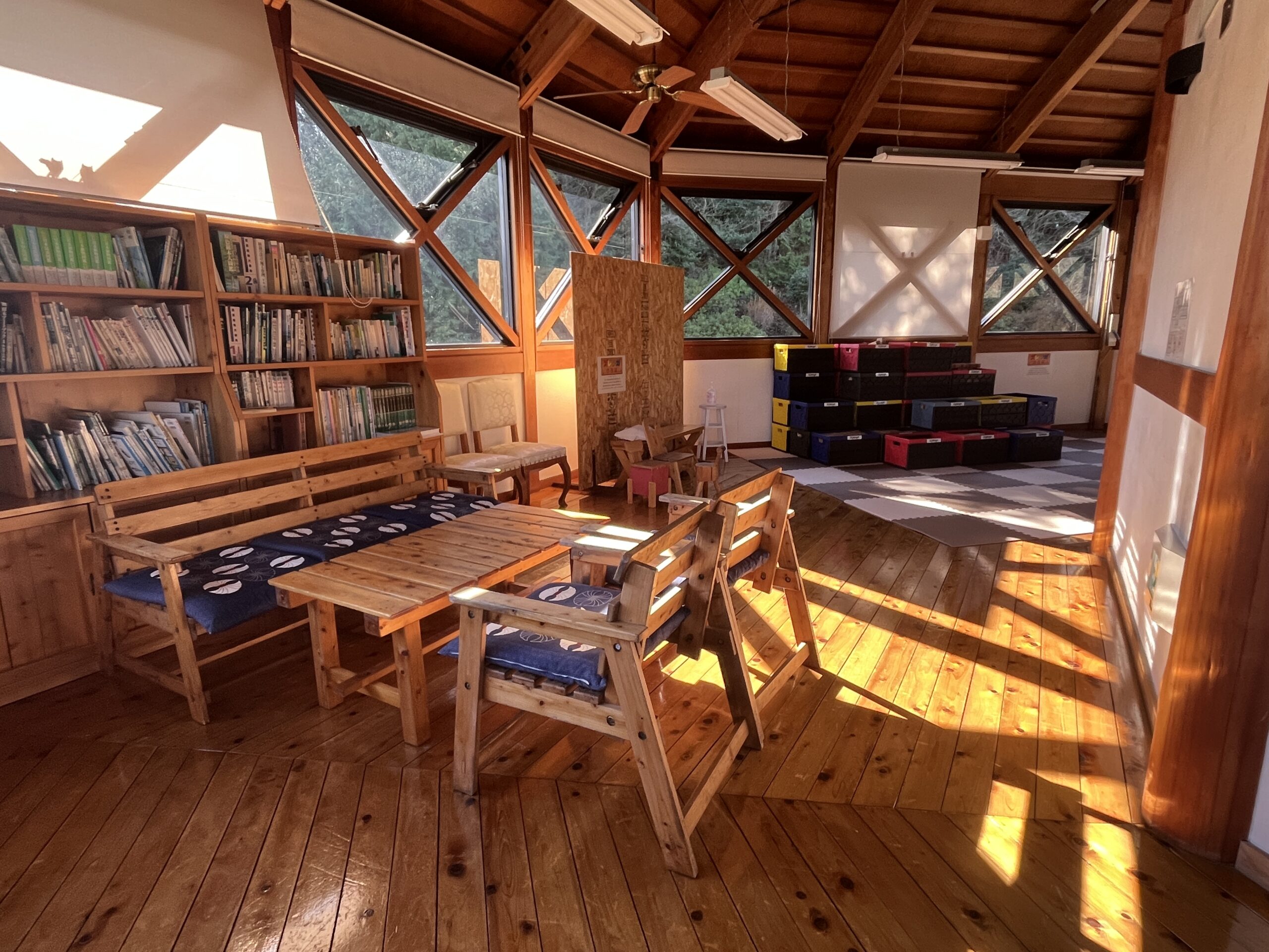 ふるさと館2階には休憩スペースがあり、無料で遊べる木のおもちゃや大きなおうちやお城が作れる木製玩具「ズレンガ」がございます。公園散策の合間にご自由にお立ち寄りください。
